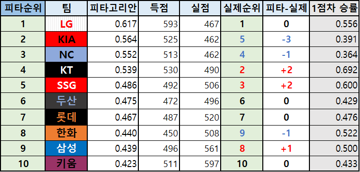| 피타순위 | 팀 | 피타고리안 | 득점 | 실점 | 실제순위 | 피타-실제 | 1점차 승률 |