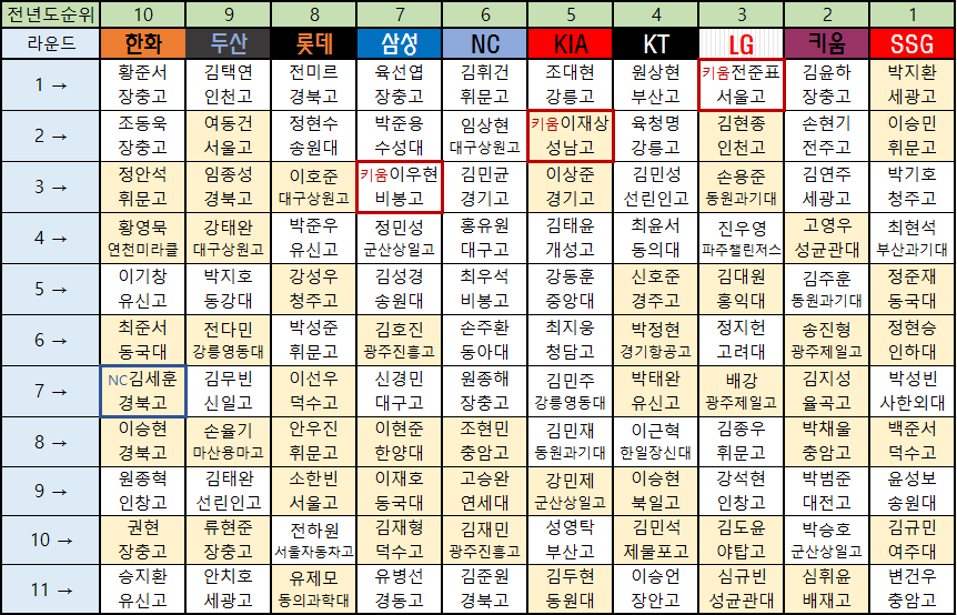 | 라운드 | 한화 | 두산 | 롯데 | 삼성 | NC | KIA | KT | LG | 키움 | SSG |