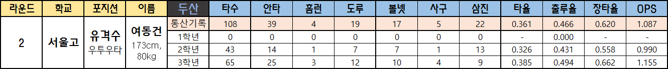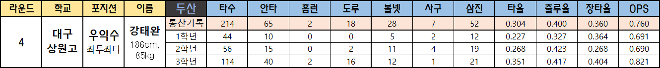 | 라운드 | 학교 | 포지션 | 이름 | 두산 | 타수 | 안타 | 홈런 | 도루 | 볼넷 | 사구 | 삼진 | 타율 | 출루율 | 장타율 | OPS |