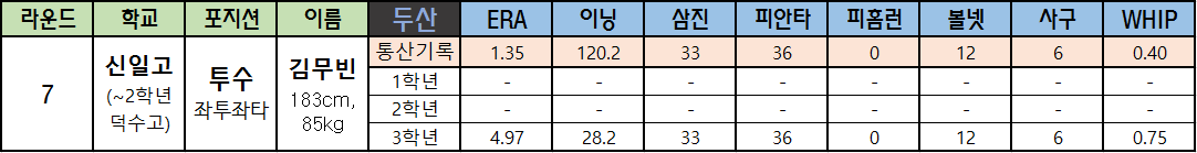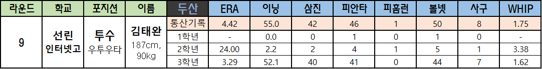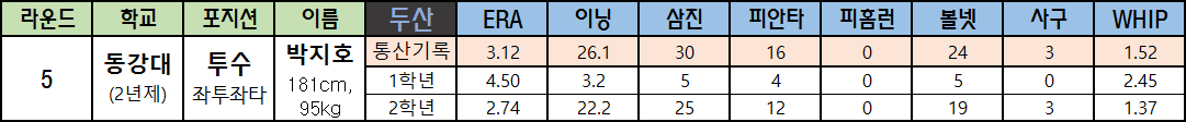 | 라운드 | 학교 | 포지션 | 이름 | 두산 | ERA | 이닝 | 삼진 | 피안타 | 피홈런 | 볼넷 | 사구 | WHIP |