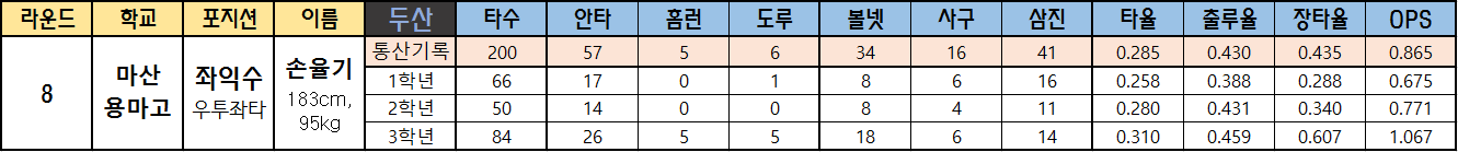 | 라운드 | 학교 | 포지션 | 이름 | 두산 | 타수 | 안타 | 홈런 | 도루 | 볼넷 | 사구 | 삼진 | 타율 | 출루율 | 장타율 | OPS |