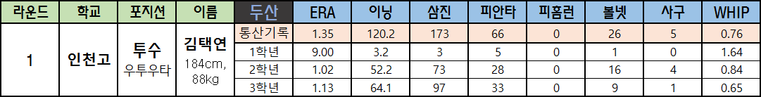 | 라운드 | 학교 | 포지션 | 이름 | 두산 | ERA | 이닝 | 삼진 | 피안타 | 피홈런 | 볼넷 | 사구 | WHIP |