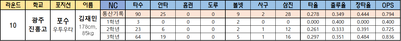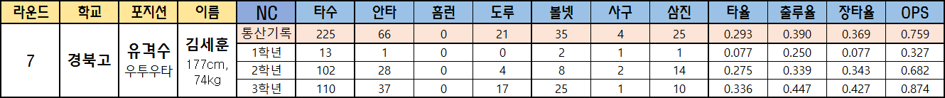 | 라운드 | 학교 | 포지션 | 이름 | NC | 타수 | 안타 | 홈런 | 도루 | 볼넷 | 사구 | 삼진 | 타율 | 출루율 | 장타율 | OPS |