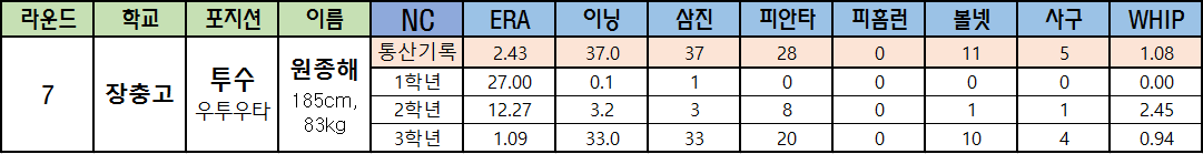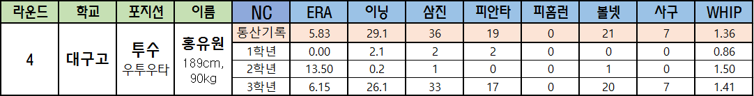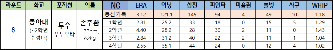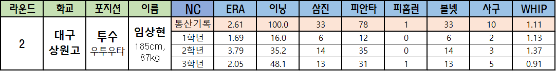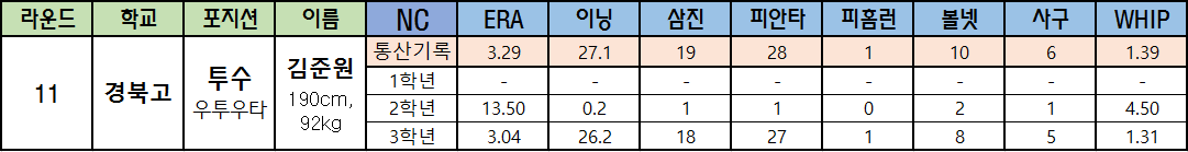 | 라운드 | 학교 | 포지션 | 이름 | NC | ERA | 이닝 | 삼진 | 피안타 | 피홈런 | 볼넷 | 사구 | WHIP |