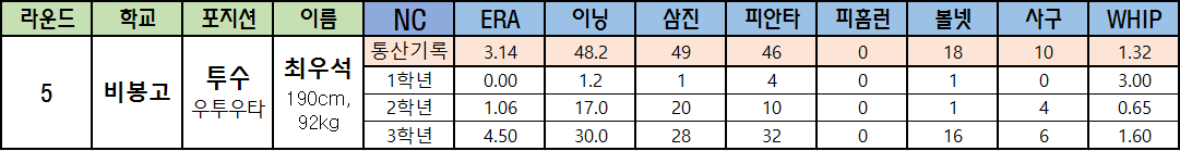 | 라운드 | 학교 | 포지션 | 이름 | NC | ERA | 이닝 | 삼진 | 피안타 | 피홈런 | 볼넷 | 사구 | WHIP |