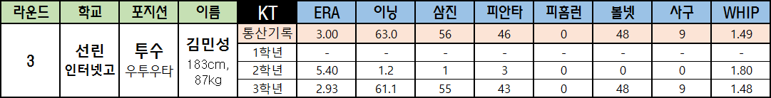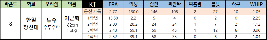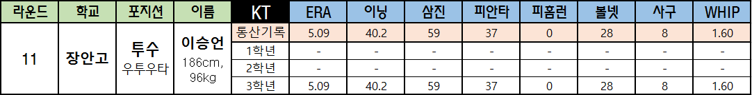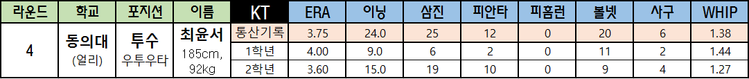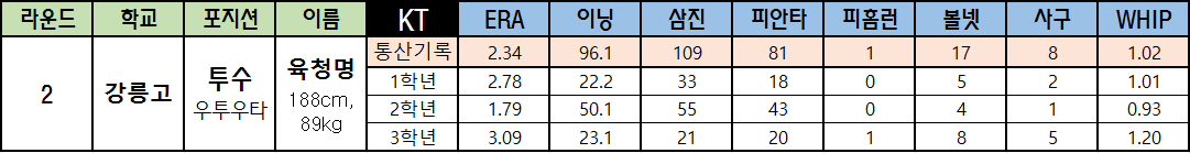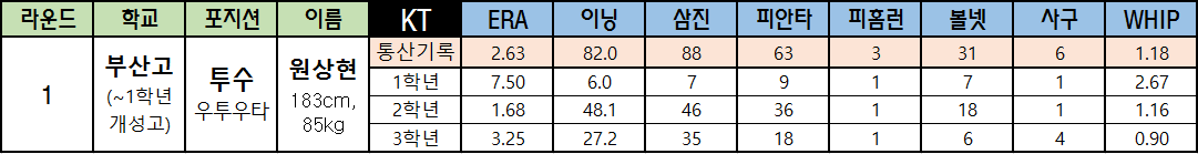 | 라운드 | 학교 | 포지션 | 이름 | KT | ERA | 이닝 | 삼진 | 피안타 | 피홈런 | 볼넷 | 사구 | WHIP |