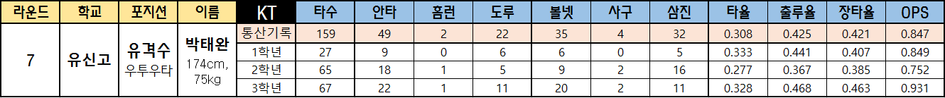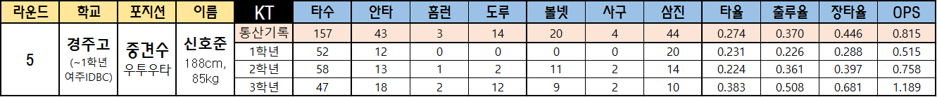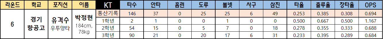 | 라운드 | 학교 | 포지션 | 이름 | KT | 타수 | 안타 | 홈런 | 도루 | 볼넷 | 사구 | 삼진 | 타율 | 출루율 | 장타율 | OPS |