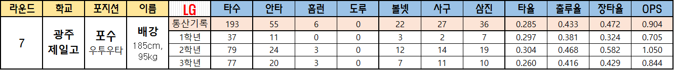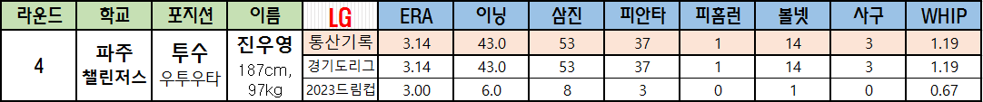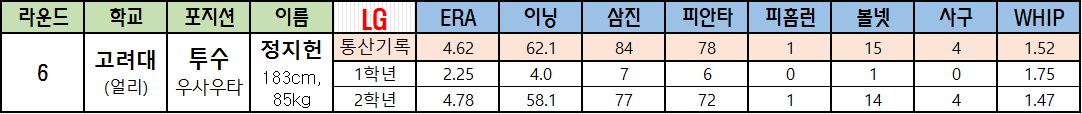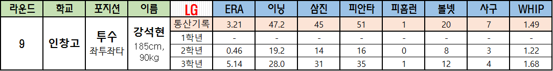 | 라운드 | 학교 | 포지션 | 이름 | LG | ERA | 이닝 | 삼진 | 피안타 | 피홈런 | 볼넷 | 사구 | WHIP |