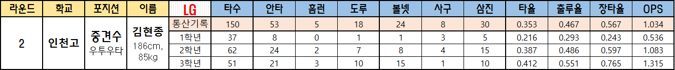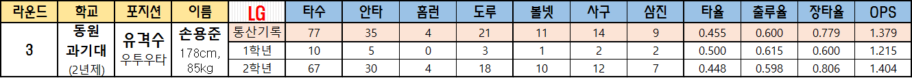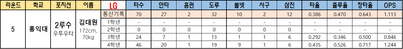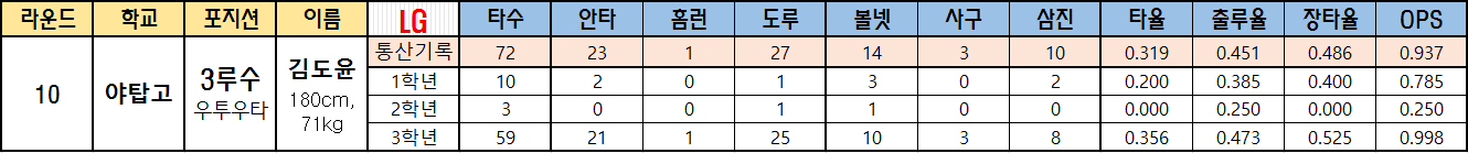 | 라운드 | 학교 | 포지션 | 이름 | LG | 타수 | 안타 | 홈런 | 도루 | 볼넷 | 사구 | 삼진 | 타율 | 출루율 | 장타율 | OPS |