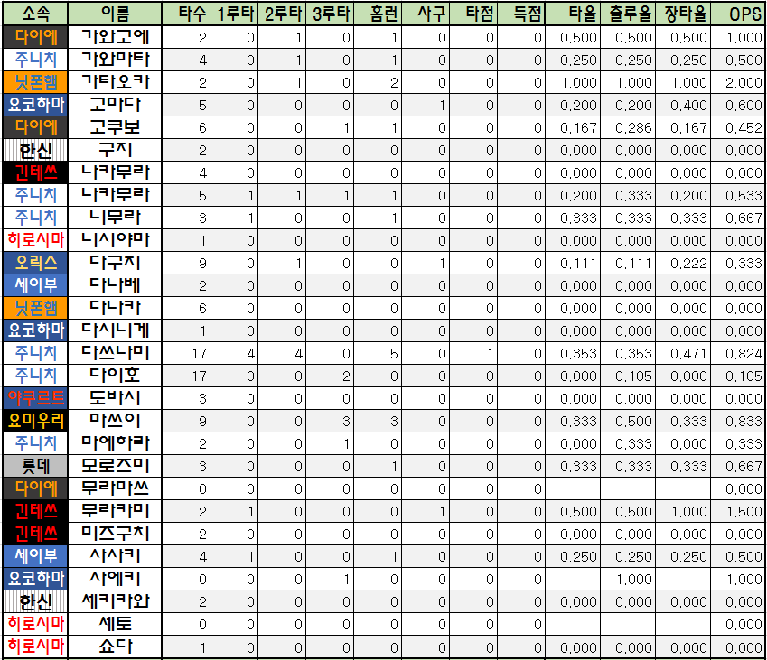 | 야쿠르트 | 도바시 | 3 | 0 | 0 | 0 | 0 | 0 | 0 | 0 | 0.000 | 0.000 | 0.000 | 0.000 |