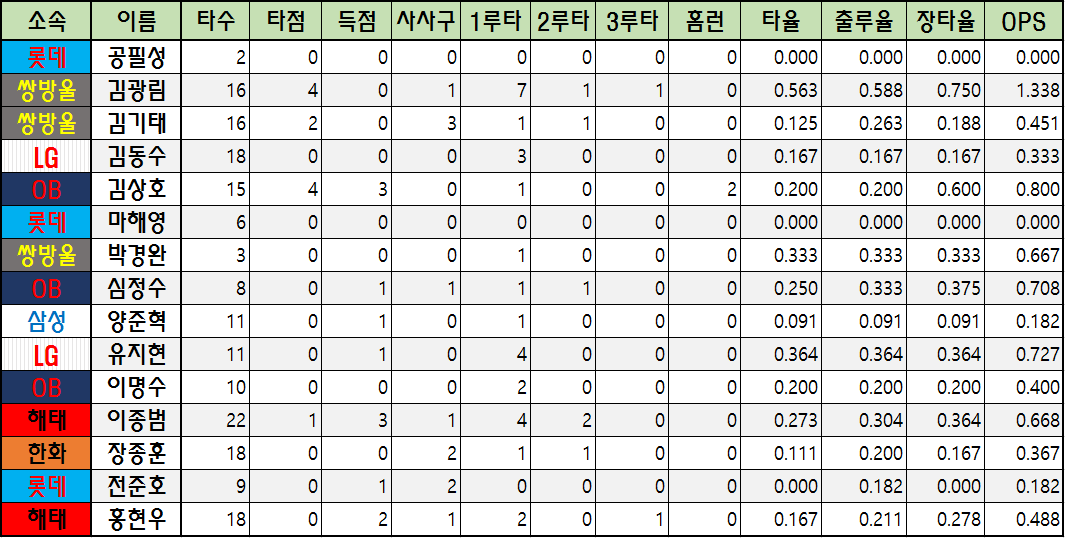| OB | 김상호 | 15 | 4 | 3 | 0 | 1 | 0 | 0 | 2 | 0.200 | 0.200 | 0.600 | 0.800 |