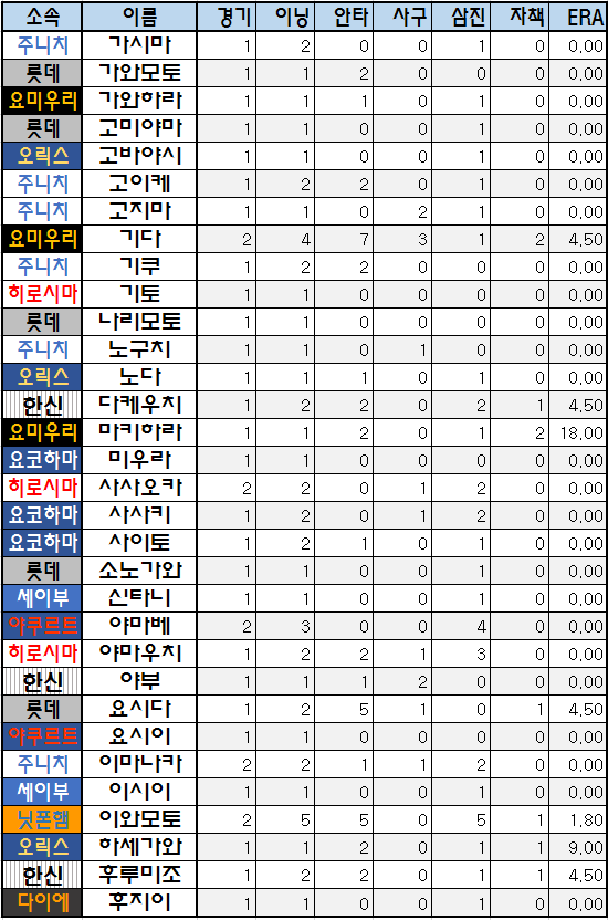 | 다이에 | 후지모토 | 2 | 0 | 0 | 0 | 0 | 0 | 0 | 0 | 0.000 | 0.000 | 0.000 | 0.000 |