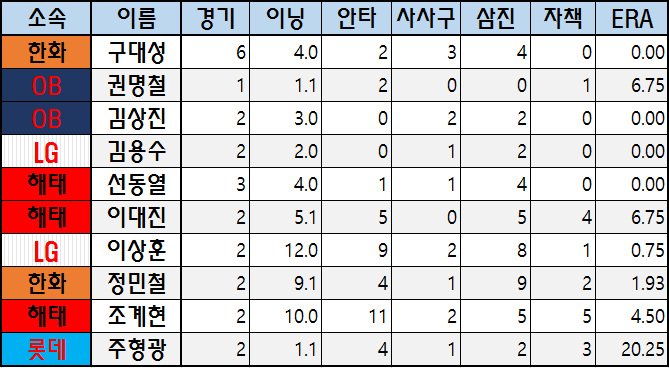 | LG | 이상훈 | 2 | 12 | 9 | 2 | 8 | 1 | 0.75 |