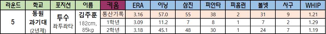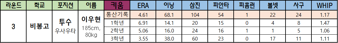 | 라운드 | 학교 | 포지션 | 이름 | 키움 | ERA | 이닝 | 삼진 | 피안타 | 피홈런 | 볼넷 | 사구 | WHIP |