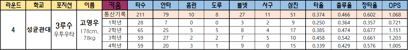 | 4 | 성균관대 | 3루수 우투우타 |