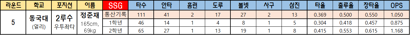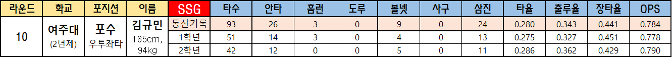 | 라운드 | 학교 | 포지션 | 이름 | SSG | 타수 | 안타 | 홈런 | 도루 | 볼넷 | 사구 | 삼진 | 타율 | 출루율 | 장타율 | OPS |