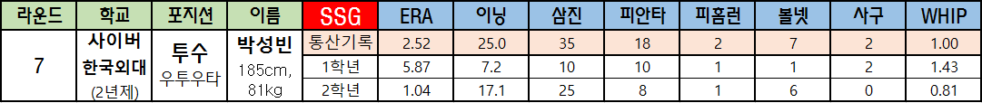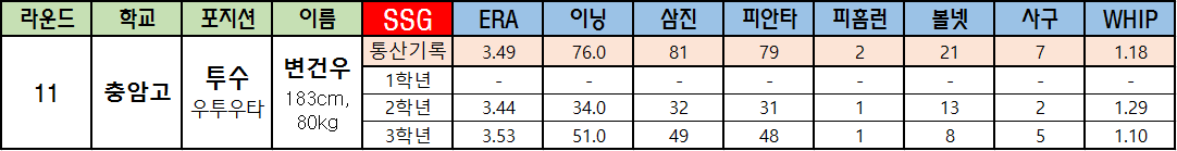 | 라운드 | 학교 | 포지션 | 이름 | SSG | ERA | 이닝 | 삼진 | 피안타 | 피홈런 | 볼넷 | 사구 | WHIP |