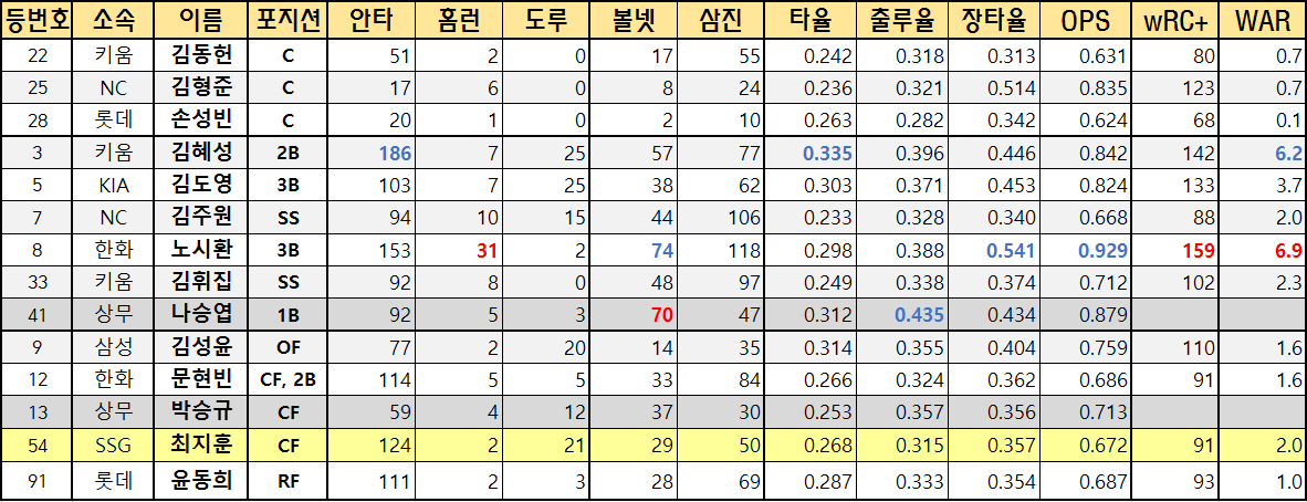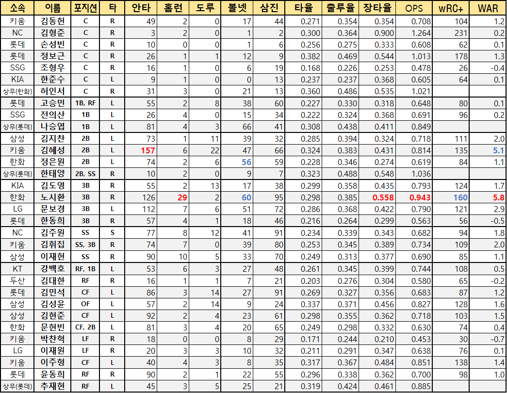 | 등번호 | 소속 | 이름 | 포지션 | 안타 | 홈런 | 도루 | 볼넷 | 삼진 | 타율 | 출루율 | 장타율 | OPS | wRC+ | WAR |