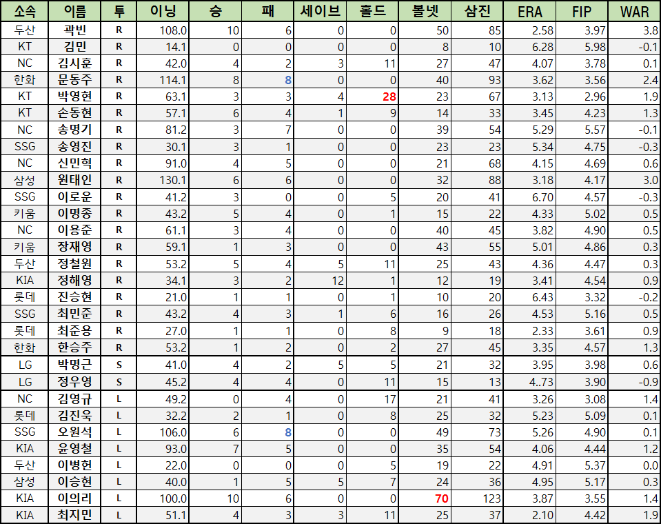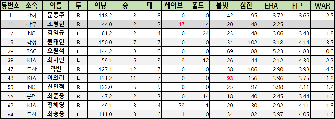 | 등번호 | 소속 | 이름 | 투 | 이닝 | 승 | 패 | 세이브 | 홀드 | 볼넷 | 삼진 | ERA | FIP | WAR |