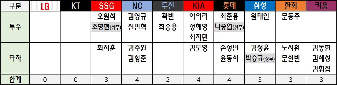 한국시리즈 참여로 LG, kt 소속 선수들인 문보경, 정우영, 박영현 이 하차했고, 강백호가 부상으로 하차하였습니다.