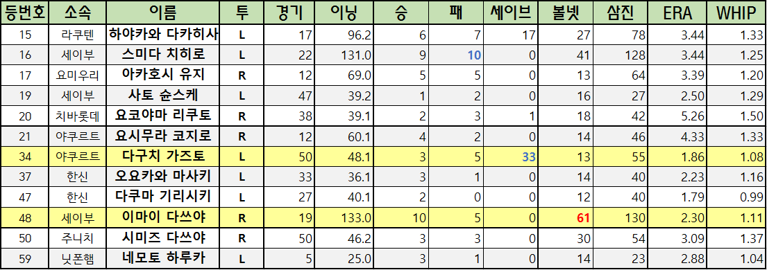 | 등번호 | 소속 | 이름 | 투 | 경기 | 이닝 | 승 | 패 | 세이브 | 볼넷 | 삼진 | ERA | WHIP |