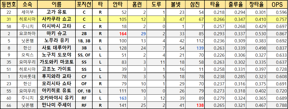 | 31 | 히로시마 | 사카쿠라 쇼고 | C | L | 105 | 12 | 3 | 47 | 67 | 0.266 | 0.347 | 0.410 | 0.757 |