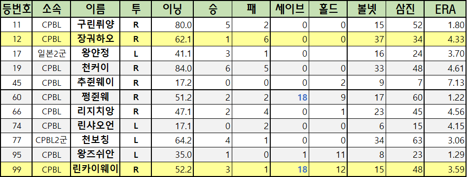 | 11 | CPBL | 구린뤼양 | R | 80.0 | 5 | 2 | 0 | 0 | 15 | 52 | 1.80 |