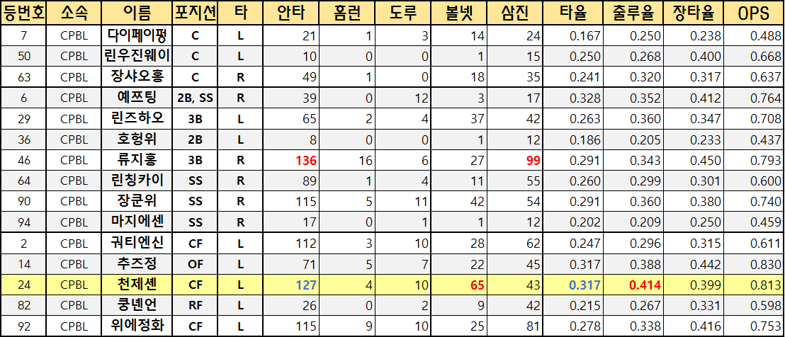 | 24 | CPBL | 천제셴 | CF | L | 127 | 4 | 10 | 65 | 43 | 0.317 | 0.414 | 0.399 | 0.813 |