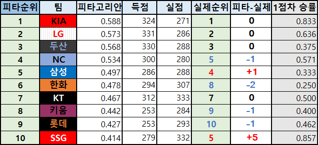 | 피타순위 | 팀 | 피타고리안 | 득점 | 실점 | 실제순위 | 피타-실제 | 1점차 승률 |