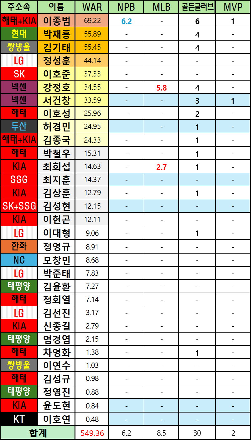기존의 메이저리그 3인방에 강정호까지 가세하여 쌓은 WAR과 선동열과 이종범이 일본에서 쌓은 WAR을 빼고도 엄청난 수치입니다.