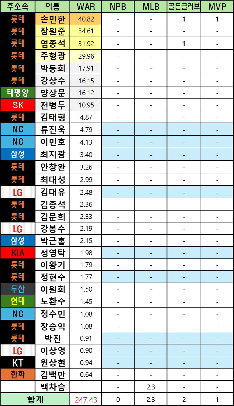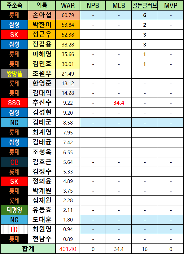 *메이저리그 WAR은 bWAR와 fWAR의 평균값으로 표기했습니다.