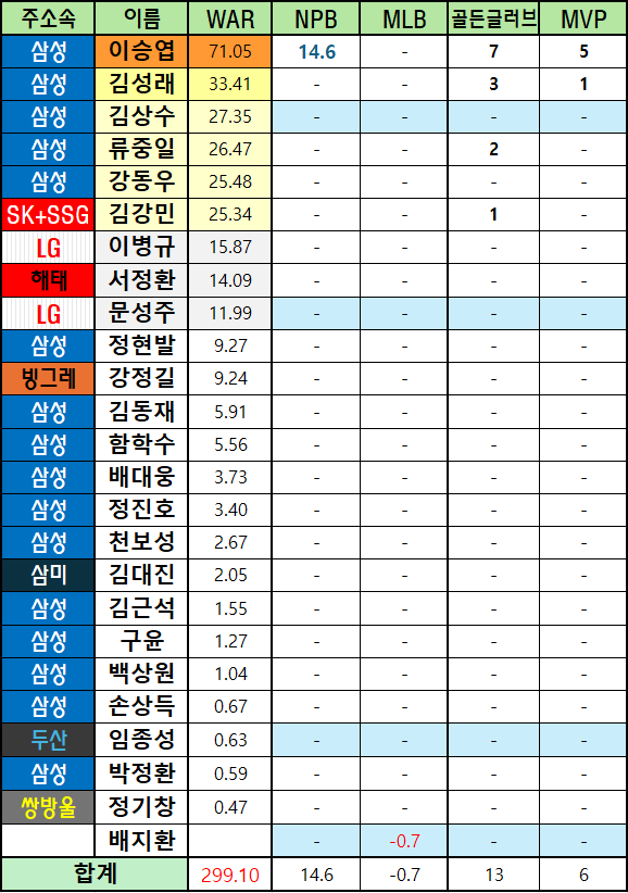 경북고등학교 출신 야구선수 WAR 23.10.18 업데이트