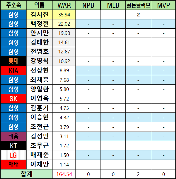| 경북고등학교 출신 야구선수 WAR (ver.2024~) 25.10.02 (0) | 2024.08.28 |