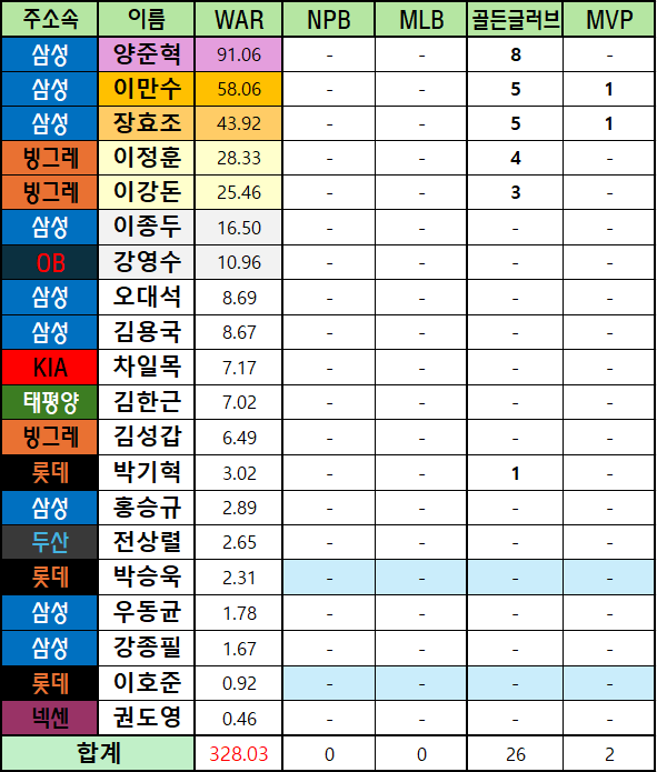 *메이저리그 WAR은 bWAR와 fWAR의 평균값으로 표기했습니다.
