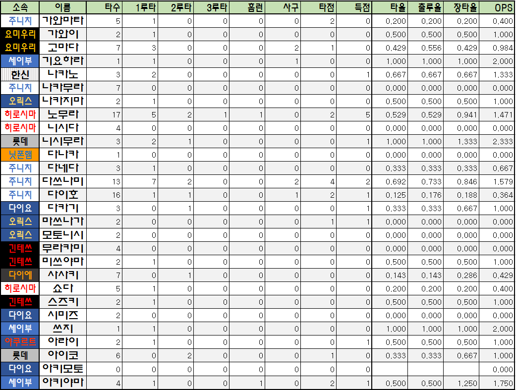| 오릭스 | 모토니시 | 2 | 0 | 0 | 0 | 0 | 0 | 0 | 0 | 0.000 | 0.000 | 0.000 | 0.000 |