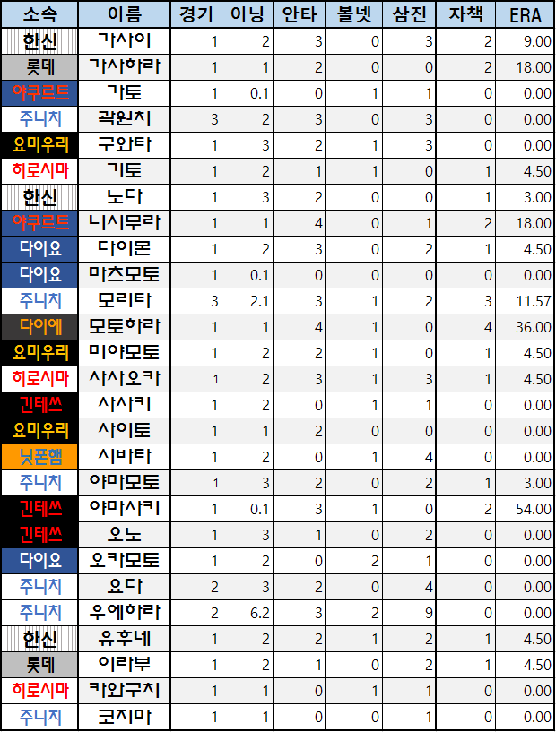 | 롯데 | 가사하라 | 1 | 1 | 2 | 0 | 0 | 2 | 18.00 |