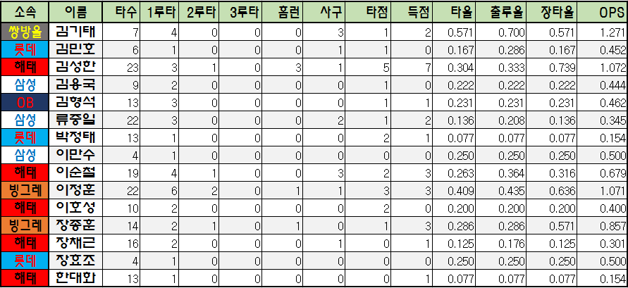 | 소속 | 이름 | 타수 | 1루타 | 2루타 | 3루타 | 홈런 | 볼넷 | 타점 | 득점 | 타율 | 출루율 | 장타율 | OPS |