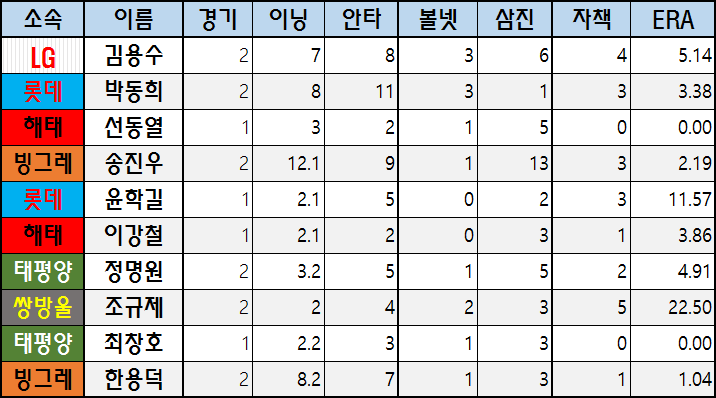 | 소속 | 이름 | 이닝 | 투구수 | 안타 | 볼넷 | 삼진 | 자책 | ERA |