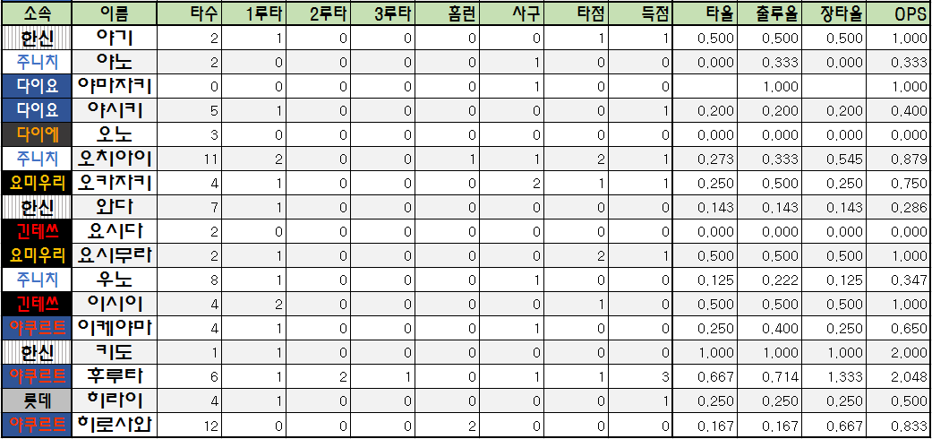 | 다이에 | 오노 | 3 | 0 | 0 | 0 | 0 | 0 | 0 | 0 | 0.000 | 0.000 | 0.000 | 0.000 |