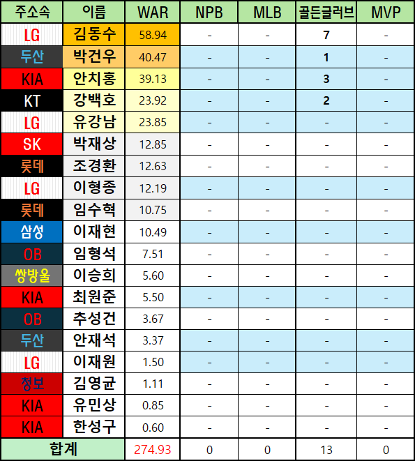*메이저리그 WAR은 bWAR와 fWAR의 평균값으로 표기했습니다.