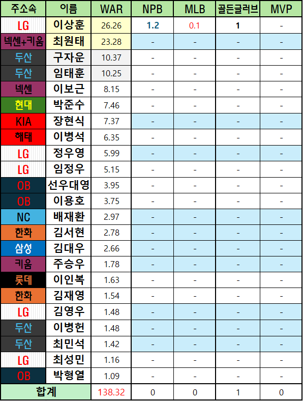 *메이저리그 WAR은 bWAR와 fWAR의 평균값으로 표기했습니다.