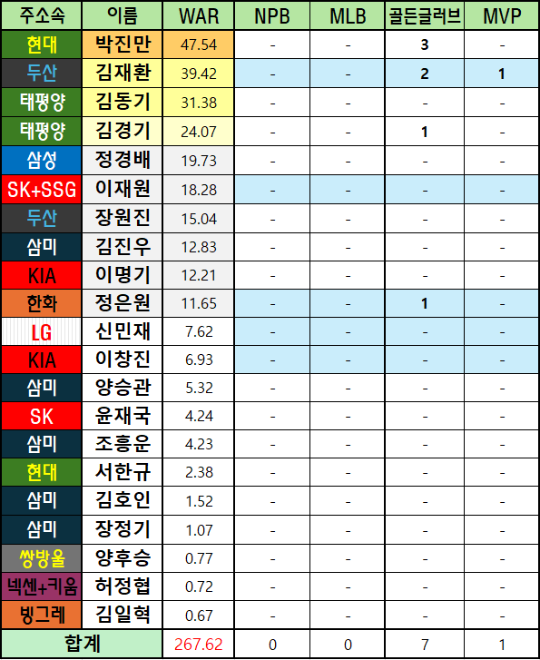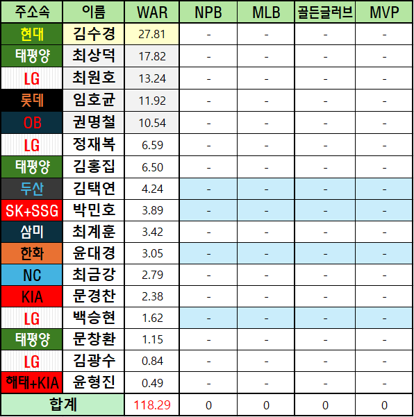 *메이저리그 WAR은 bWAR와 fWAR의 평균값으로 표기했습니다.