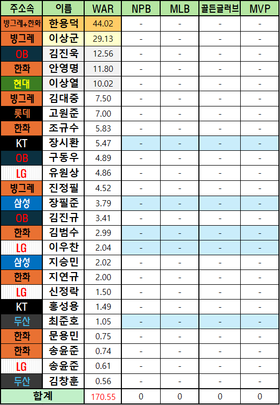 *메이저리그 WAR은 bWAR와 fWAR의 평균값으로 표기했습니다.