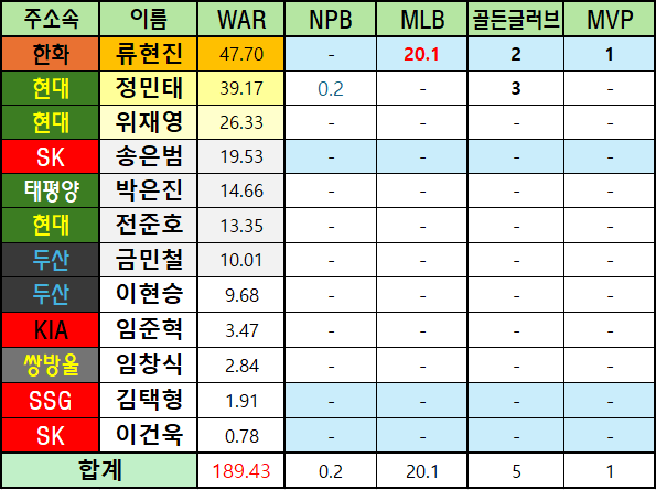 *메이저리그 WAR은 bWAR와 fWAR의 평균값으로 표기했습니다.