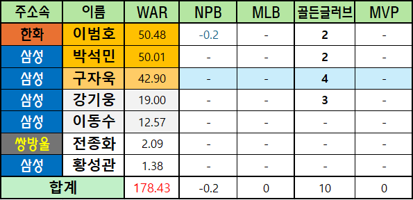 | 주소속 | 이름 | WAR | NPB | MLB | 골든글러브 | MVP |