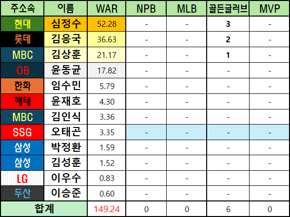 *메이저리그 WAR은 bWAR와 fWAR의 평균값으로 표기했습니다.