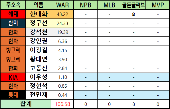 *메이저리그 WAR은 bWAR와 fWAR의 평균값으로 표기했습니다.