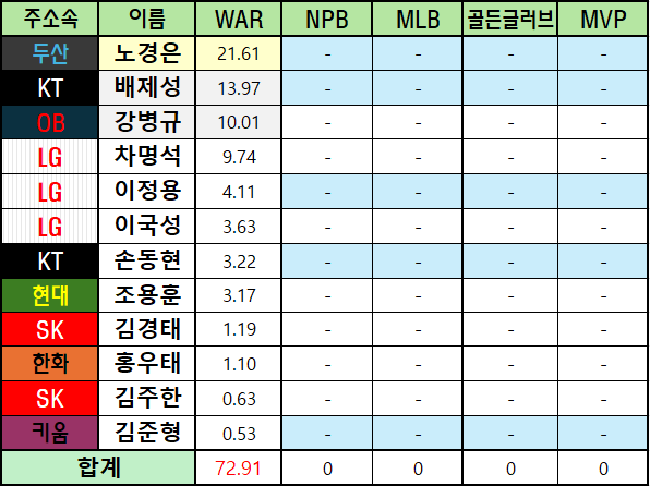 *메이저리그 WAR은 bWAR와 fWAR의 평균값으로 표기했습니다.