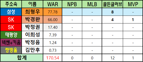 *메이저리그 WAR은 bWAR와 fWAR의 평균값으로 표기했습니다.