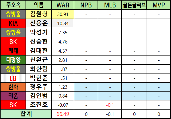 | 주소속 | 이름 | WAR | NPB | MLB | 골든글러브 | MVP |